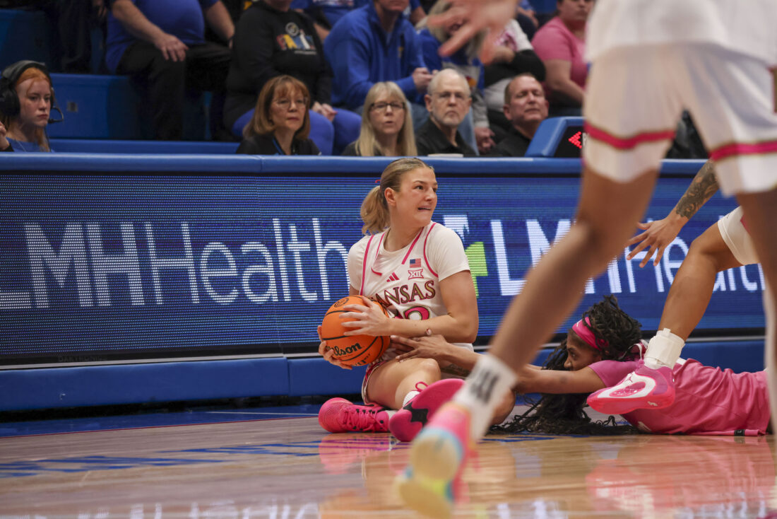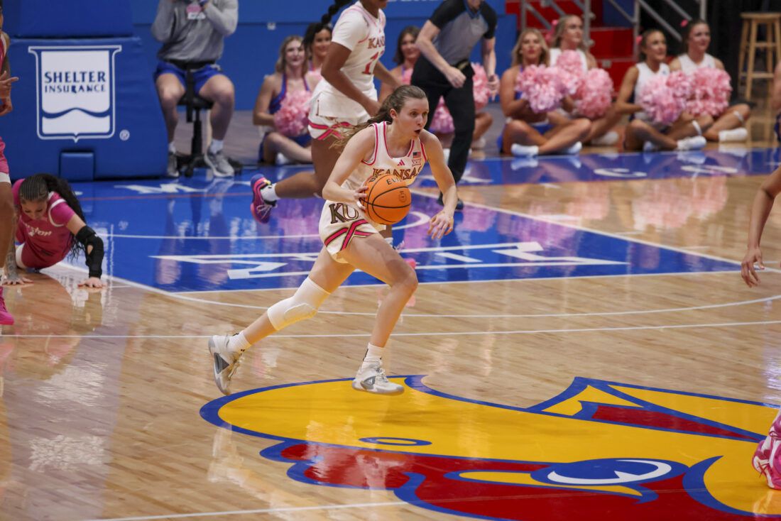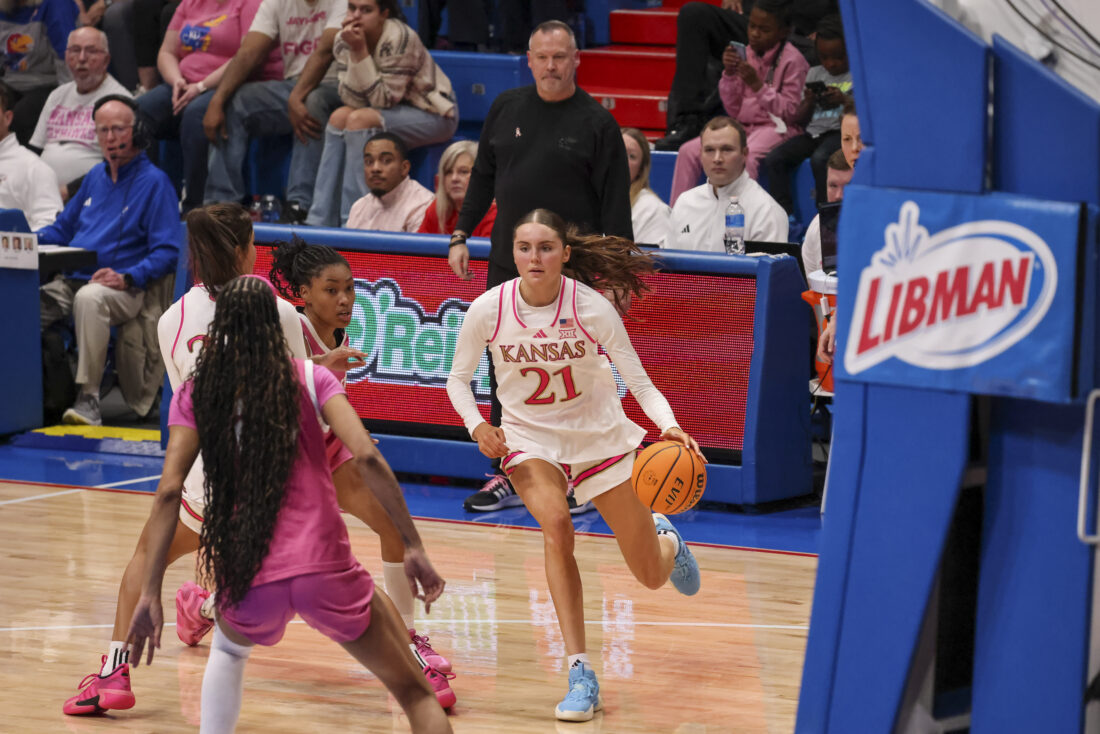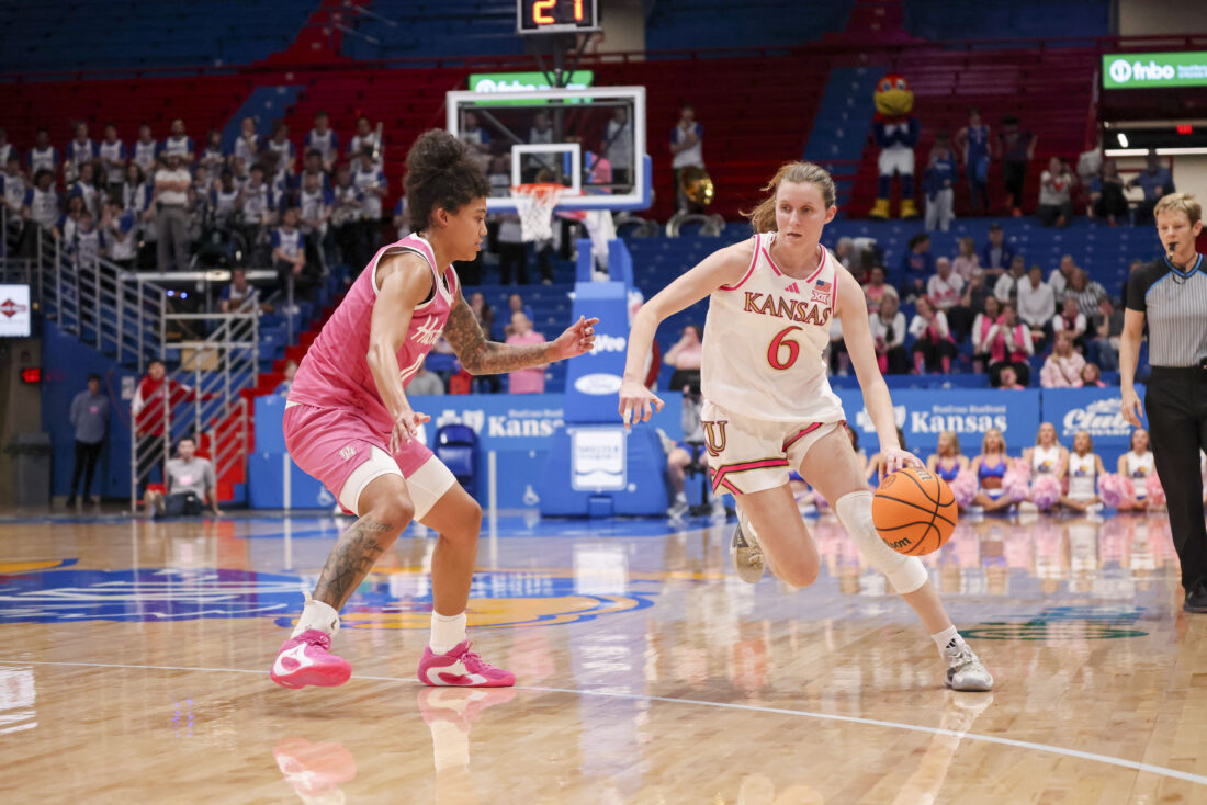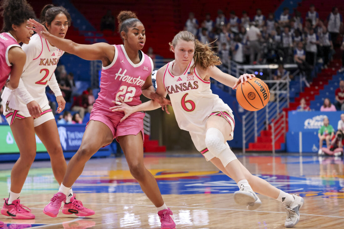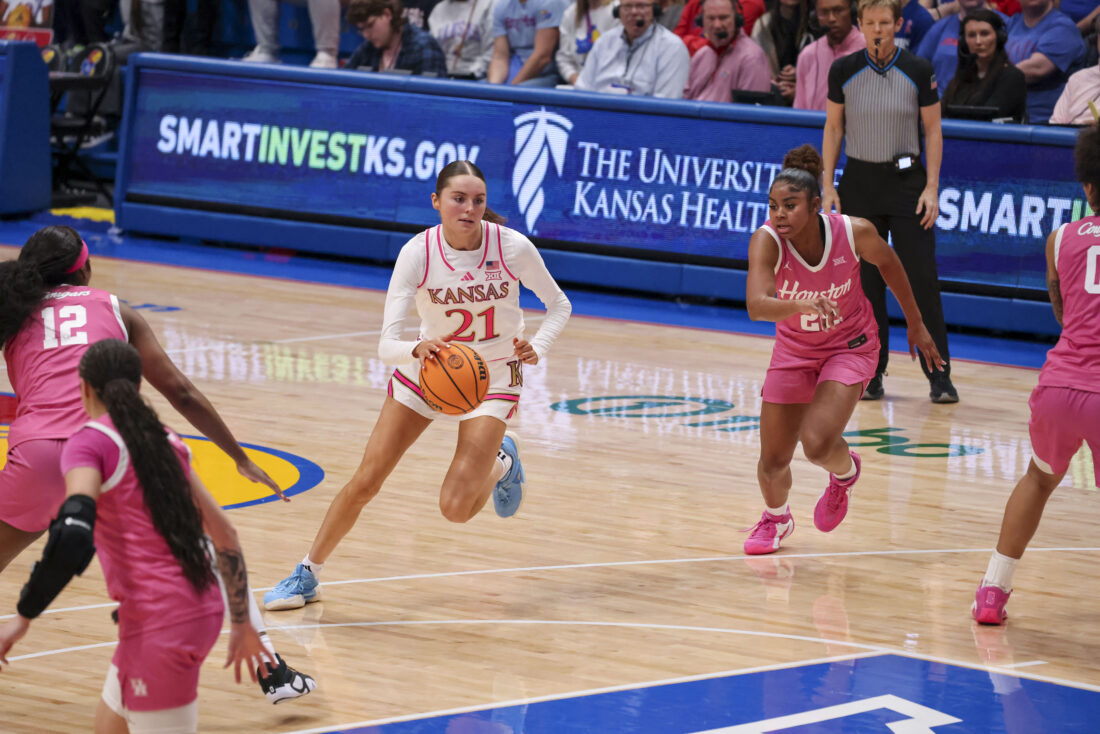 Kansas guard Libby Fandel looks for options after picking up a loose ball during the Jayhawks’ game against Houston on Saturday, Feb. 14, 2026, at Allen Fieldhouse in Lawrence.