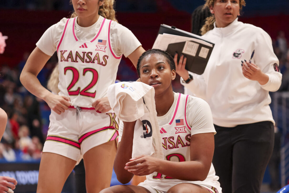 Kansas guard S’Mya Nichols takes a seat during a timeout in the Jayhawks’ game against Houston on Saturday, Feb. 14, 2026, at Allen Fieldhouse in Lawrence.