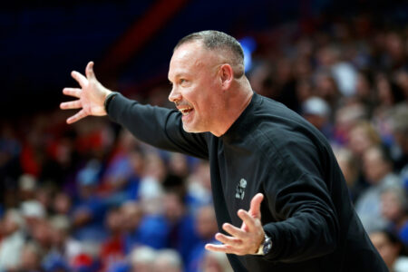 Kansas head coach Brandon Schneider reacts during the first half of an NCAA college basketball game against West Virginia on Thursday, Jan. 1, 2026, in Lawrence.