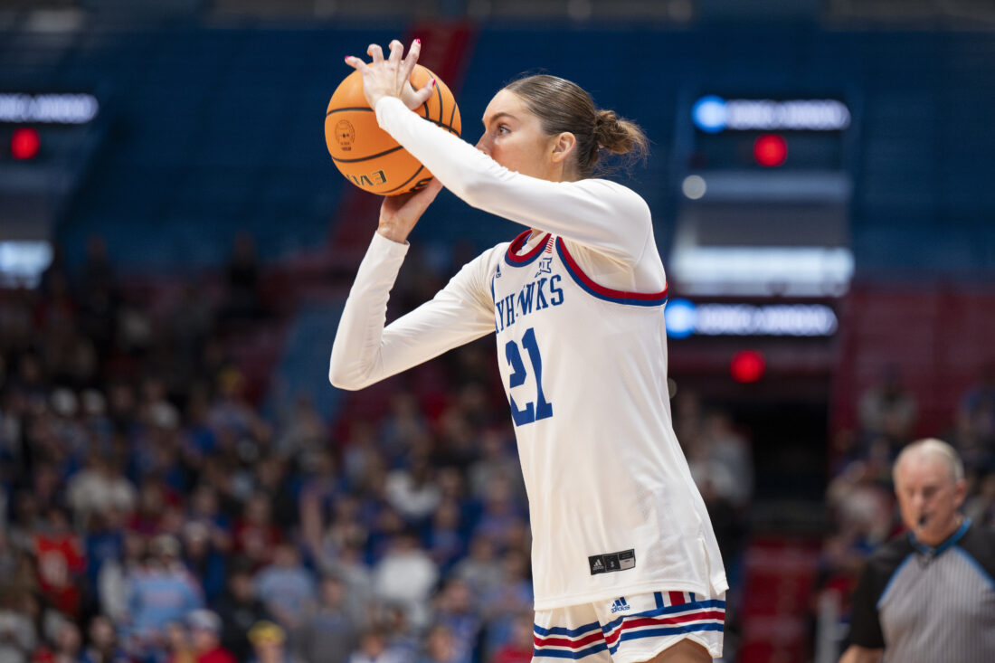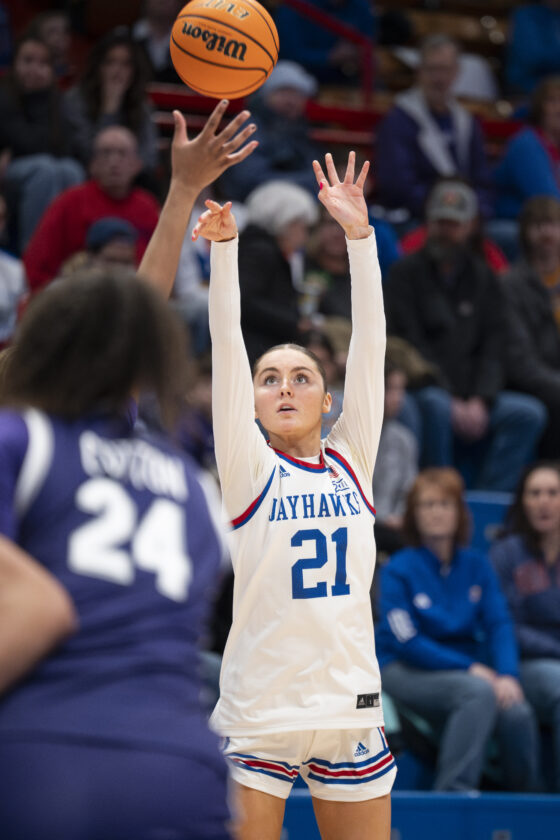 Kansas guard Elle Evans fires a 3-pointer against Kansas State in Allen Fieldhouse on Sunday, Jan. 25, 2026 in Lawrence.