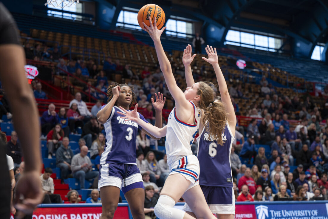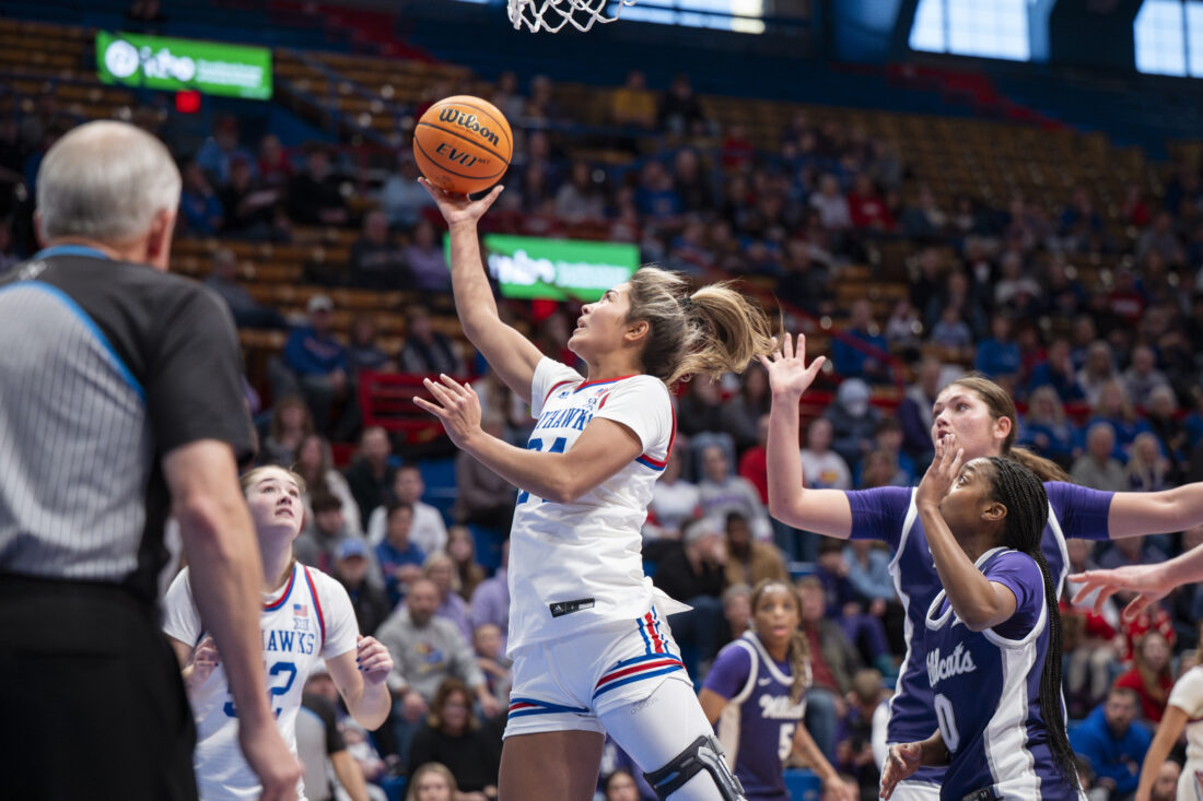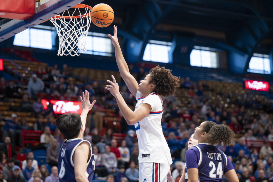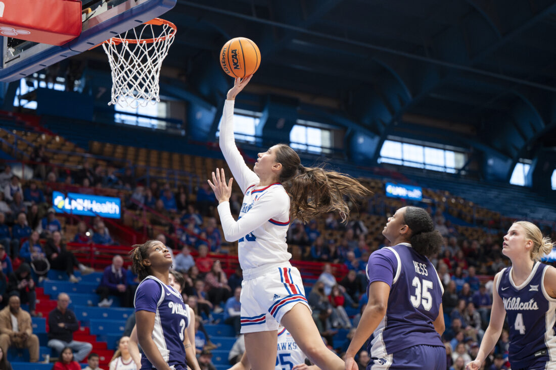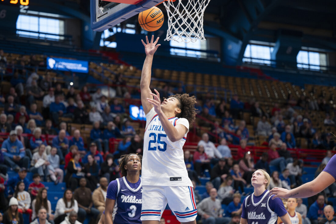 Kansas forward Regan Williams makes a layup against Kansas State in Allen Fieldhouse on Sunday, Jan. 25, 2026 in Lawrence.