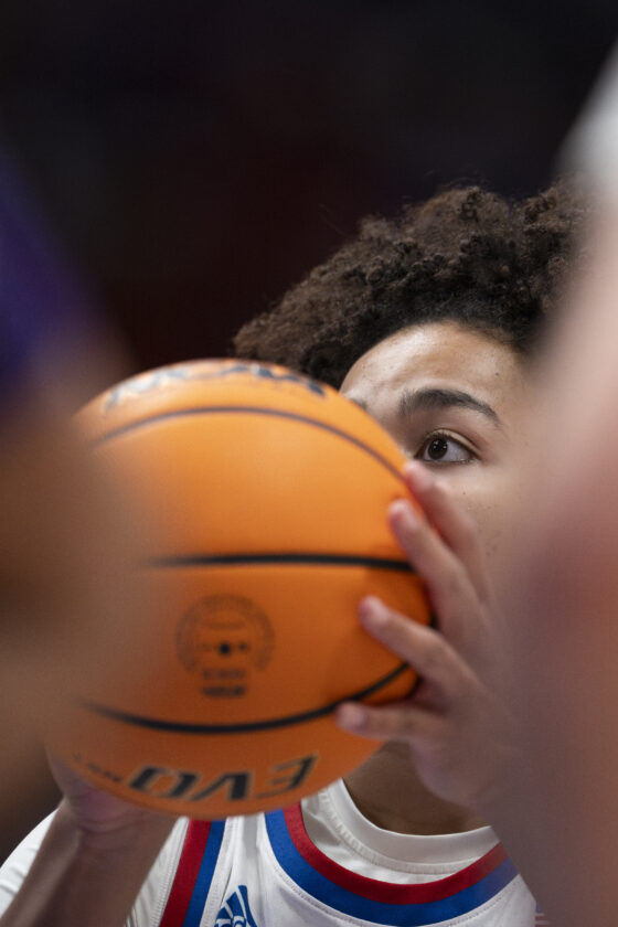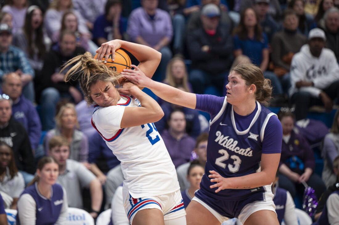 Kansas forward Regan Williams fights off a defender for the ball against Kansas State in Allen Fieldhouse on Sunday, Jan. 25, 2026 in Lawrence.