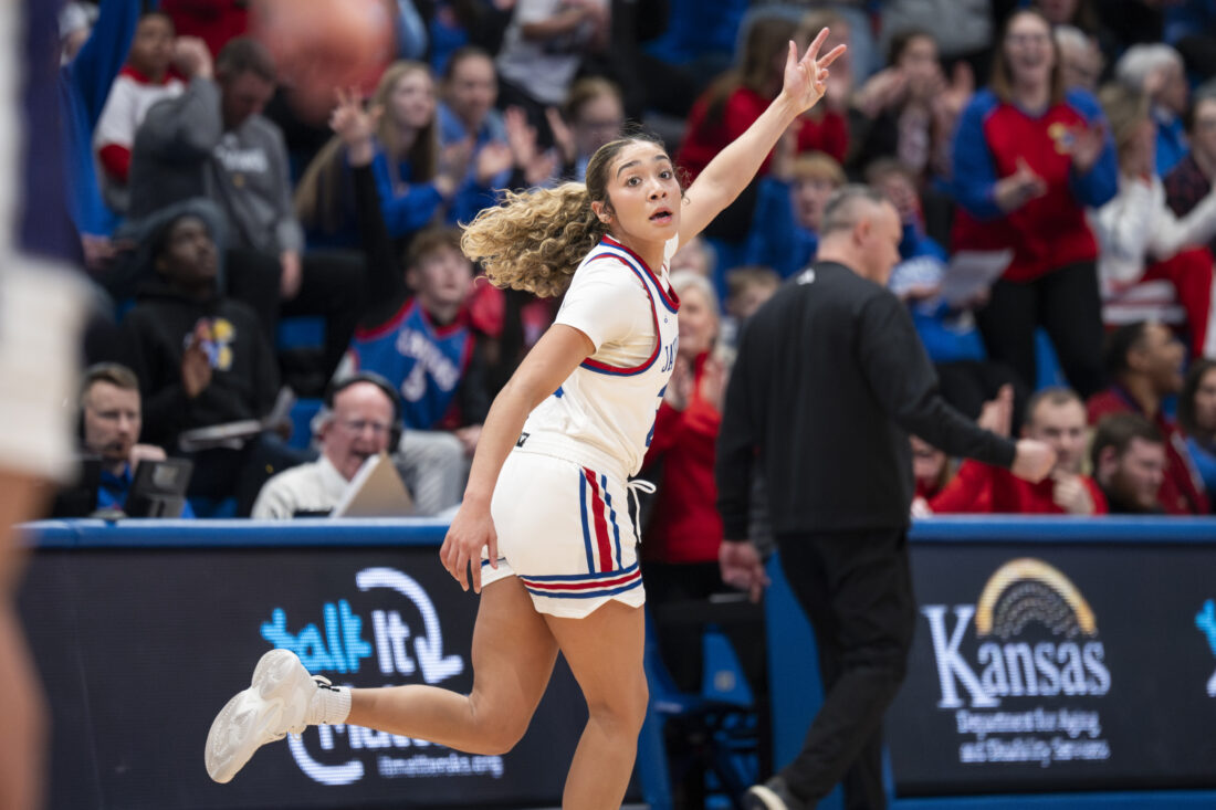 Kansas guard Sania Copeland celebrates making a 3-pointer against Kansas State in Allen Fieldhouse on Sunday, Jan. 25, 2026 in Lawrence.