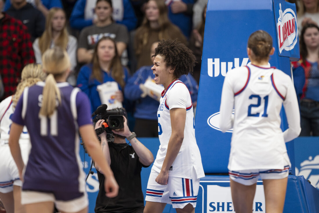 Kansas forward Jaliya Davis yells out in celebration after making a block against Kansas State in Allen Fieldhouse on Sunday, Jan. 25, 2026 in Lawrence.