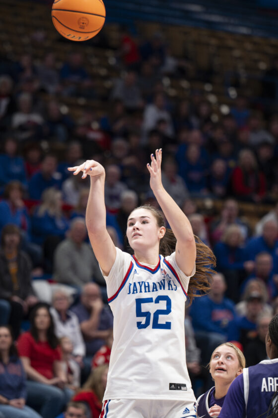 Kansas guard Elle Evans lines up a 3-pointer against Kansas State in Allen Fieldhouse on Sunday, Jan. 25, 2026 in Lawrence.