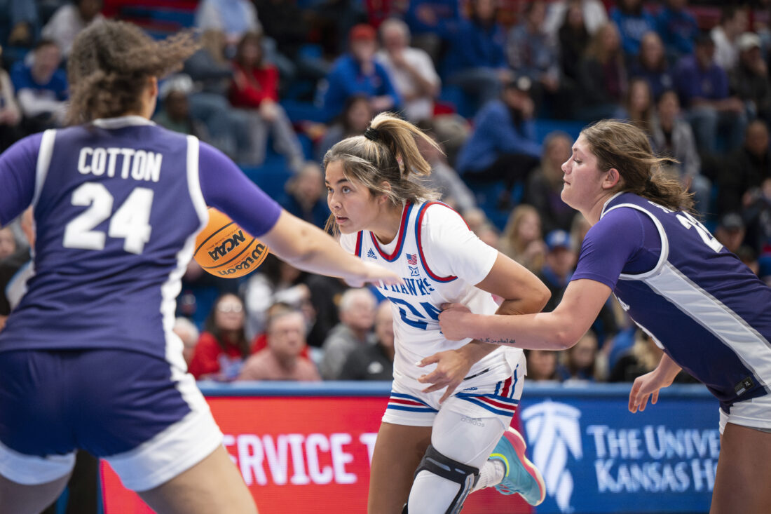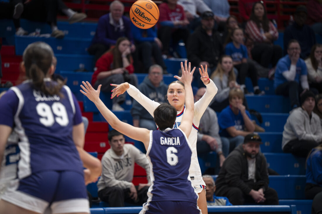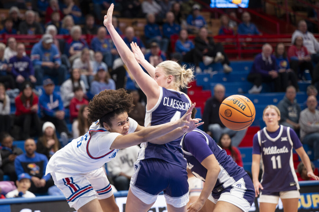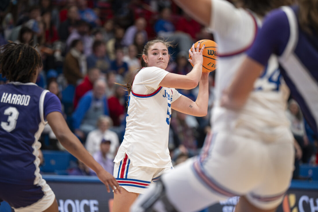 Kansas forward Lilly Meister looks to pass the ball to a teammate against Kansas State in Allen Fieldhouse on Sunday, Jan. 25, 2026 in Lawrence.