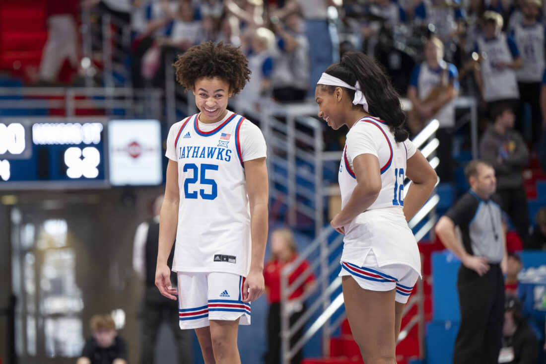 Kansas forward Jaliya Davis and guard S’Mya Nichols share a laugh during a break in play against Kansas State in Allen Fieldhouse on Sunday, Jan. 25, 2026 in Lawrence.