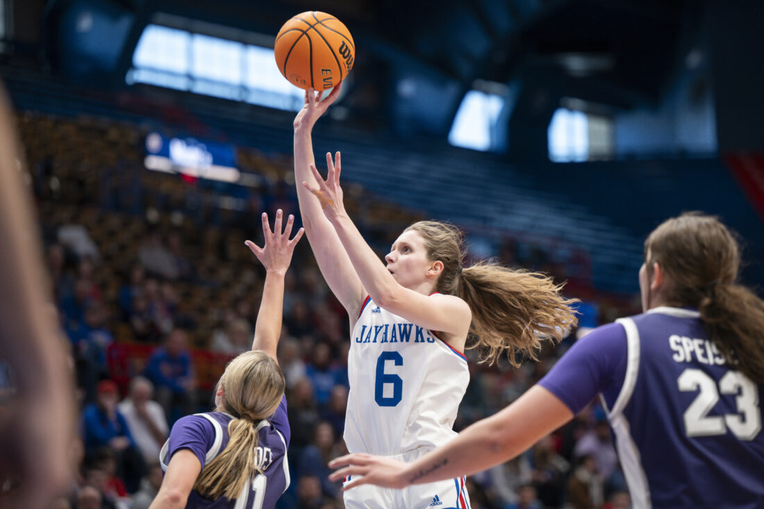Kansas forward Lilly Meister makes a short-range shot against Kansas State in Allen Fieldhouse on Sunday, Jan. 25, 2026 in Lawrence.