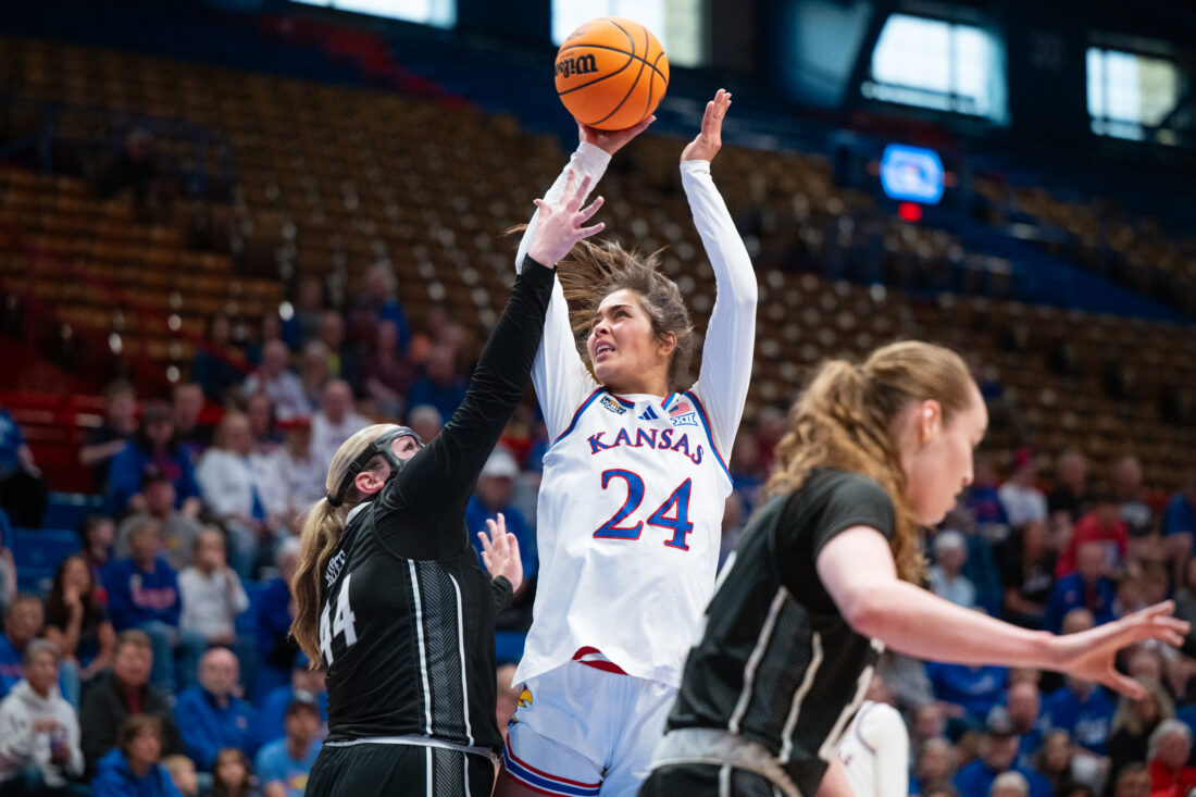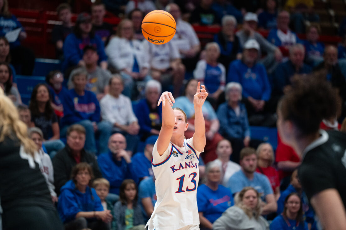 Kansas guard Libby Fandel releases a 3-pointer against Rice during the Women’s Basketball Invitation Tournament on Sunday, March 22, 2026 in Allen Fieldhouse.