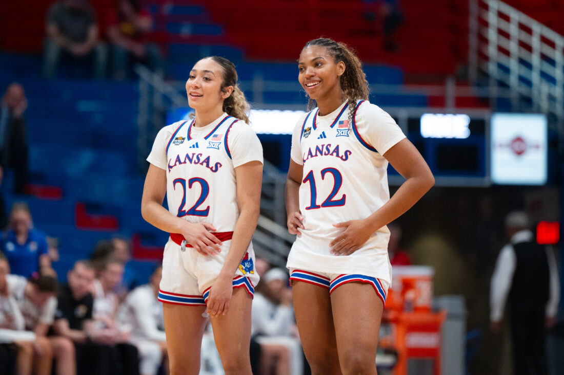 Kansas guards Sania Copeland and S’Mya Nichols share a smile during a break in play against Rice during the Women’s Basketball Invitation Tournament on Sunday, March 22, 2026 in Allen Fieldhouse.