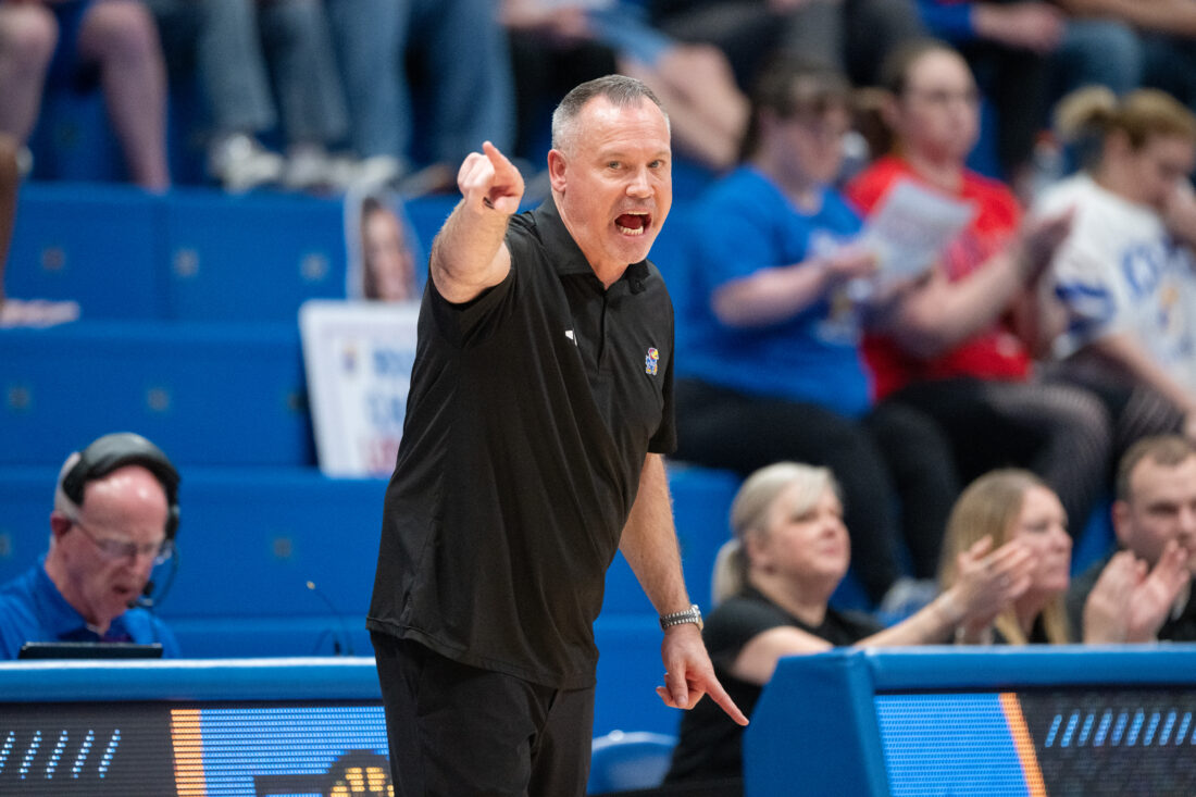 Kansas head coach Brandon Schneider calls out a play against Rice during the Women’s Basketball Invitation Tournament on Sunday, March 22, 2026 in Allen Fieldhouse.