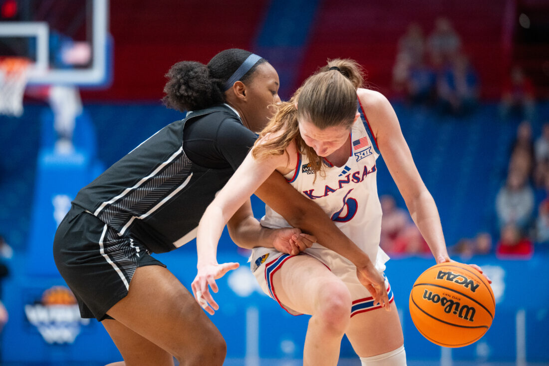 Kansas guard Laia Conesa is fouled by Rice guard Jordin Blackmon during the Women’s Basketball Invitation Tournament on Sunday, March 22, 2026 in Allen Fieldhouse.