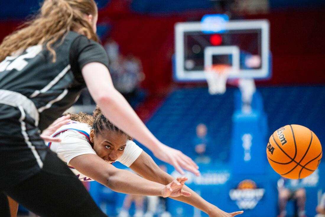 Kansas guard S’Mya Nichols makes a pass to a teammate against Rice during the Women’s Basketball Invitation Tournament on Sunday, March 22, 2026 in Allen Fieldhouse.