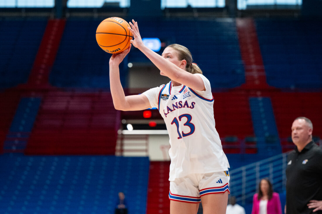 Kansas guard Libby Fandel lines up a 3-pointer against Rice during the Women’s Basketball Invitation Tournament on Sunday, March 22, 2026 in Allen Fieldhouse.