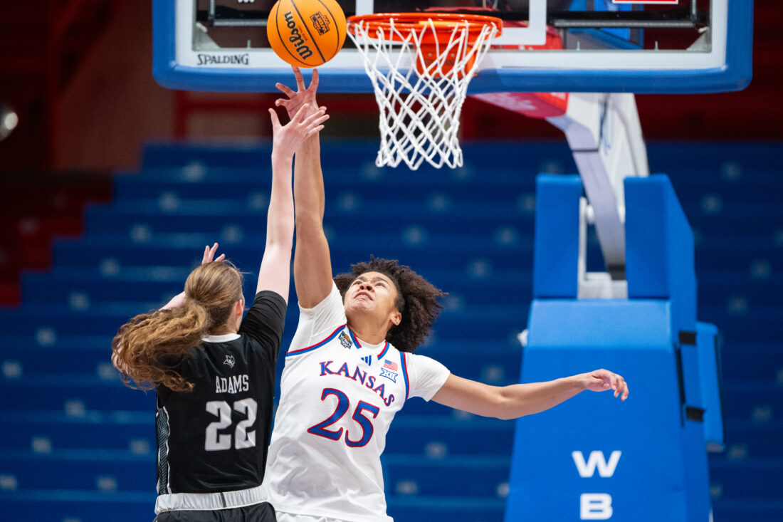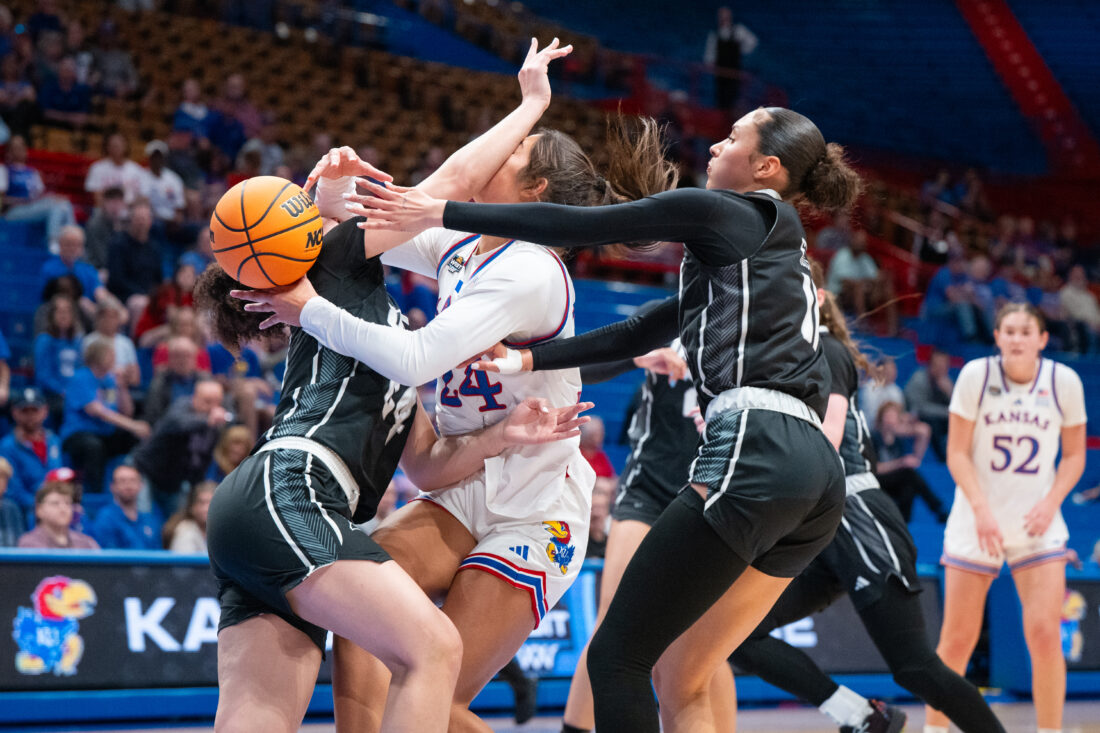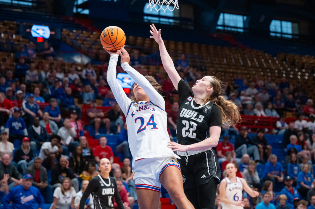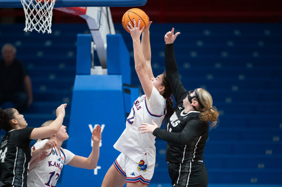 Kansas forward Lilly Meister reaches up for a rebound against Rice during the Women’s Basketball Invitation Tournament on Sunday, March 22, 2026 in Allen Fieldhouse.