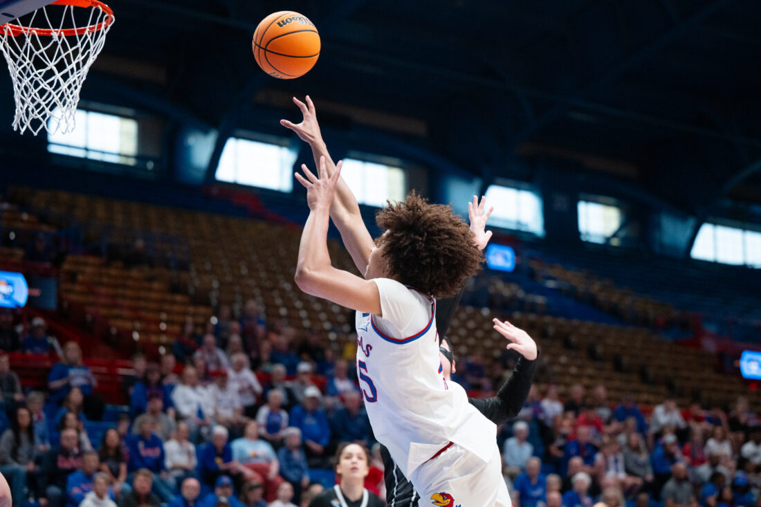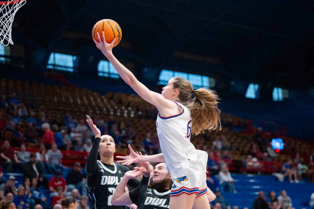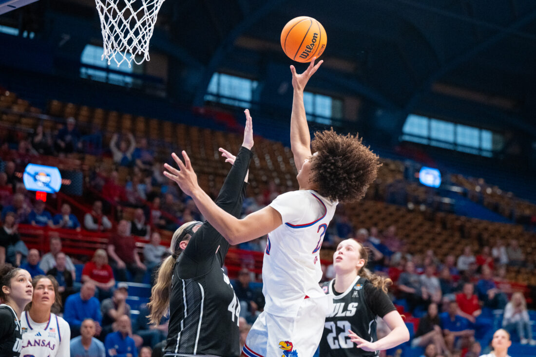 Kansas forward Regan Williams makes a layup against Rice during the Women’s Basketball Invitation Tournament on Sunday, March 22, 2026 in Allen Fieldhouse.