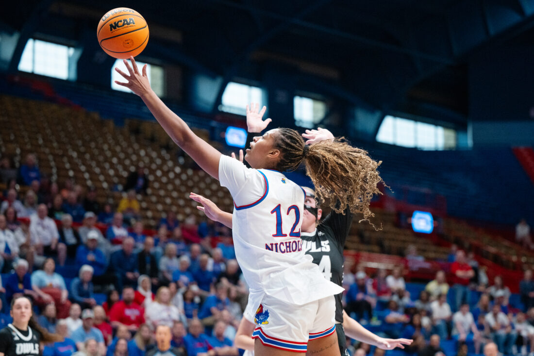 Kansas guard S’Mya Nichols makes an underhand layup against Rice during the Women’s Basketball Invitation Tournament on Sunday, March 22, 2026 in Allen Fieldhouse.