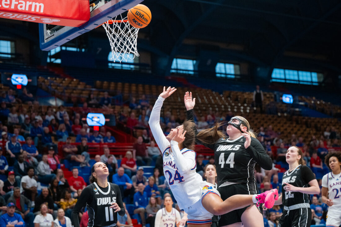 Kansas guard S’Mya Nichols is fouled while going up for a layup against Rice during the Women’s Basketball Invitation Tournament on Sunday, March 22, 2026 in Allen Fieldhouse.