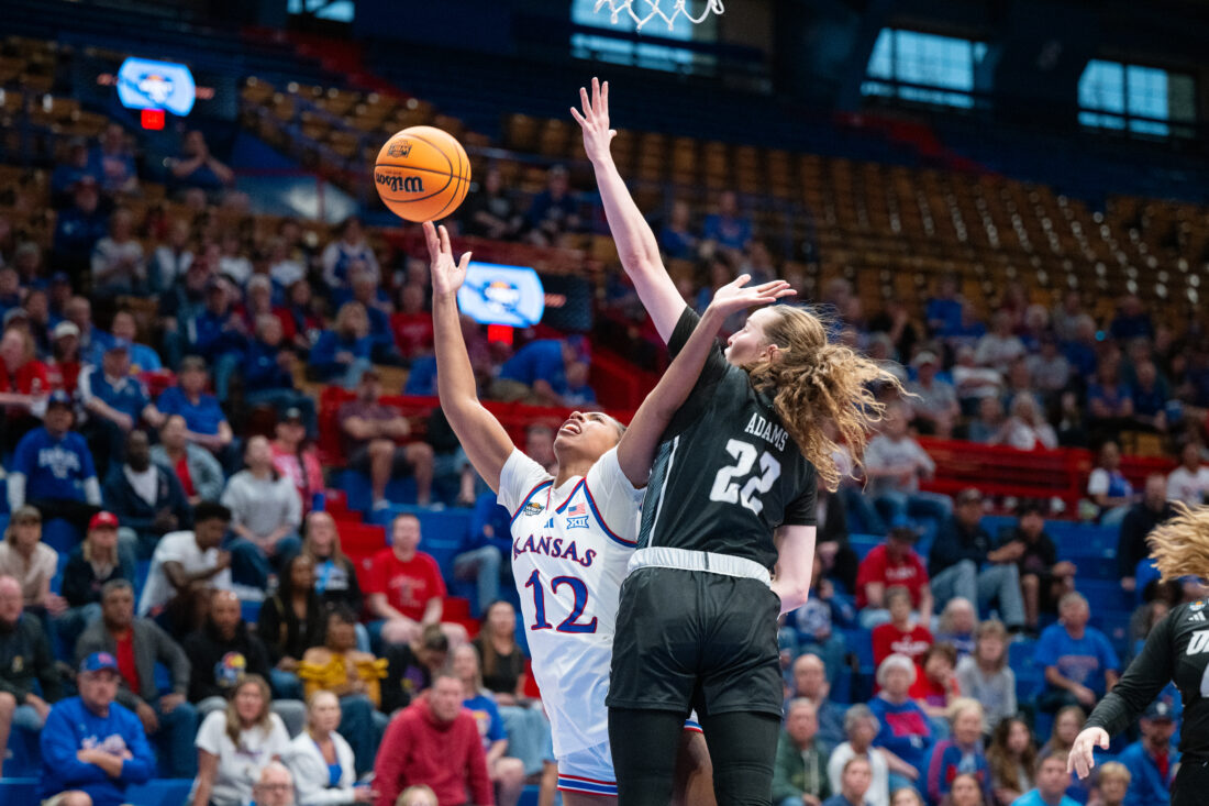 Kansas guard Sania Copeland hits a 3-pointer against Rice during the Women’s Basketball Invitation Tournament on Sunday, March 22, 2026 in Allen Fieldhouse.