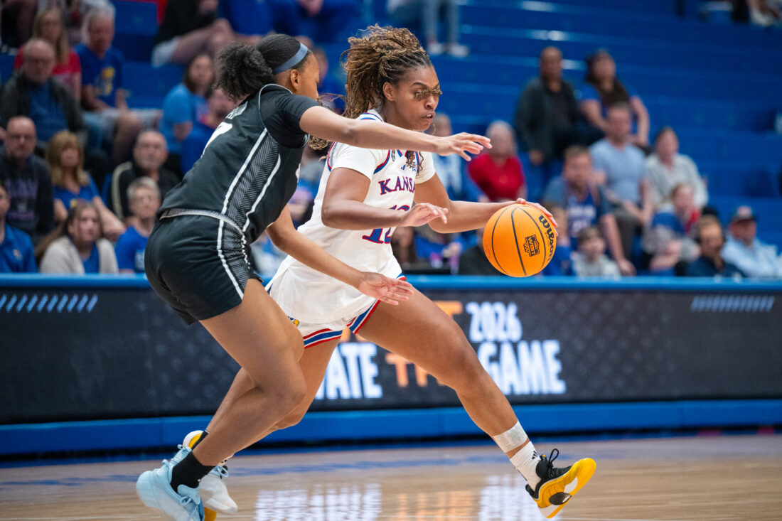 Kansas guard S’Mya Nichols dribbles past a defender against Rice during the Women’s Basketball Invitation Tournament on Sunday, March 22, 2026 in Allen Fieldhouse.