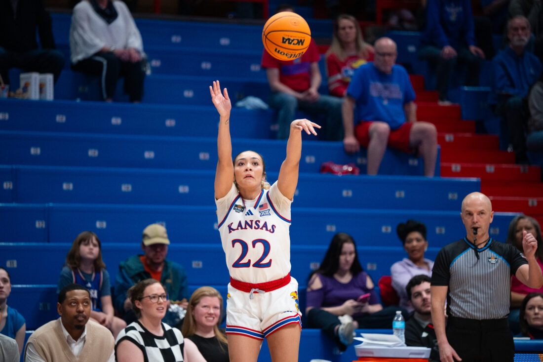 Kansas guard Libby Fandel fires a 3-pointer against Rice during the Women’s Basketball Invitation Tournament on Sunday, March 22, 2026 in Allen Fieldhouse.