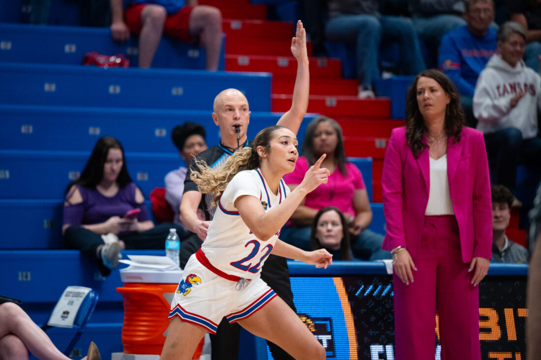 Kansas guard Sania Copeland acknowledges an assist against Rice during the Women’s Basketball Invitation Tournament on Sunday, March 22, 2026 in Allen Fieldhouse.