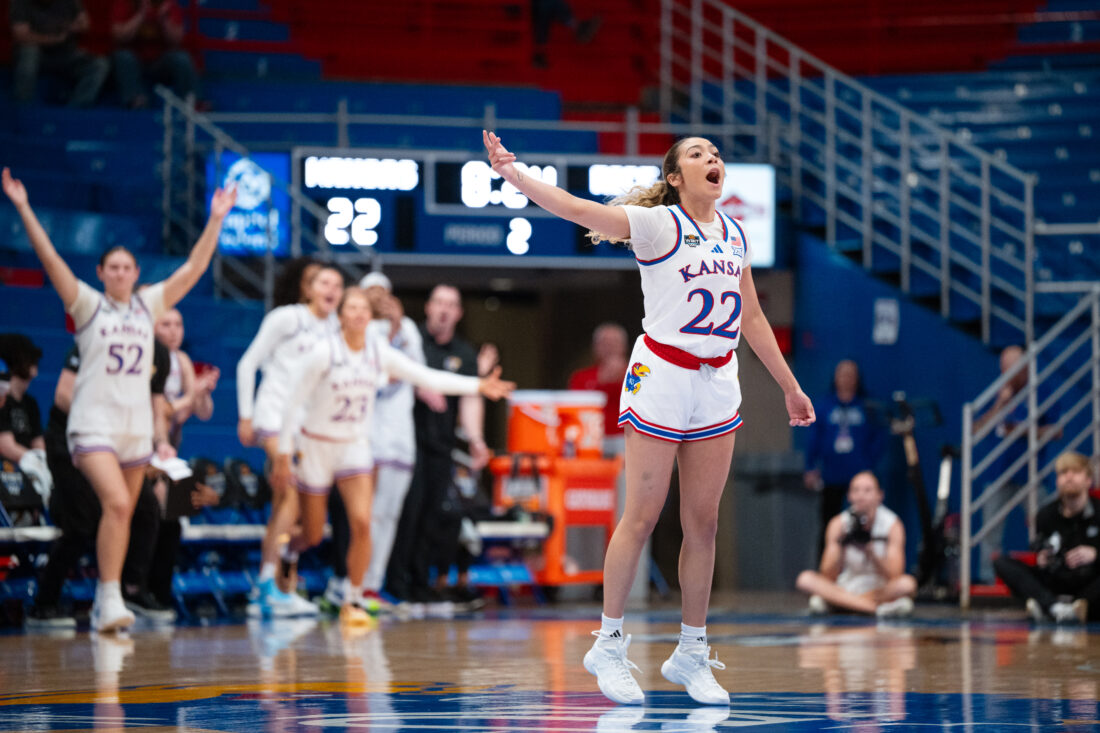 Kansas guard Sania Copeland celebrates a 3-pointer by a teammate against Rice during the Women’s Basketball Invitation Tournament on Sunday, March 22, 2026 in Allen Fieldhouse.