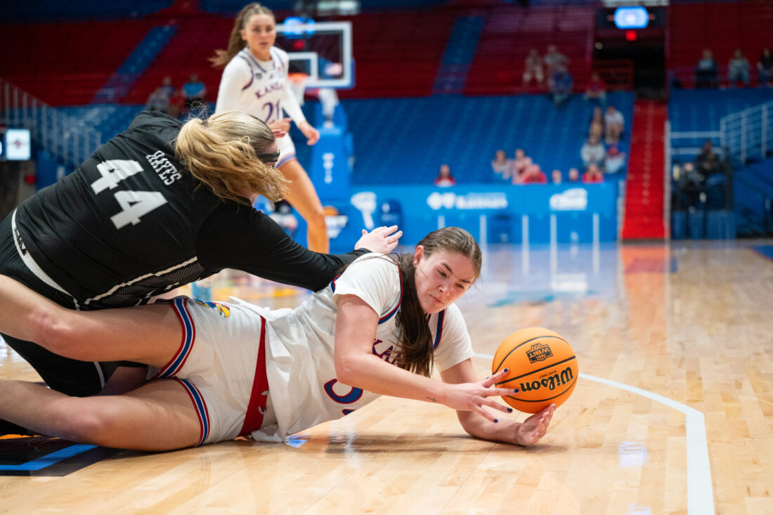 Kansas forward Lilly Meister dives to the floor for a loose ball against Rice during the Women’s Basketball Invitation Tournament on Sunday, March 22, 2026 in Allen Fieldhouse.