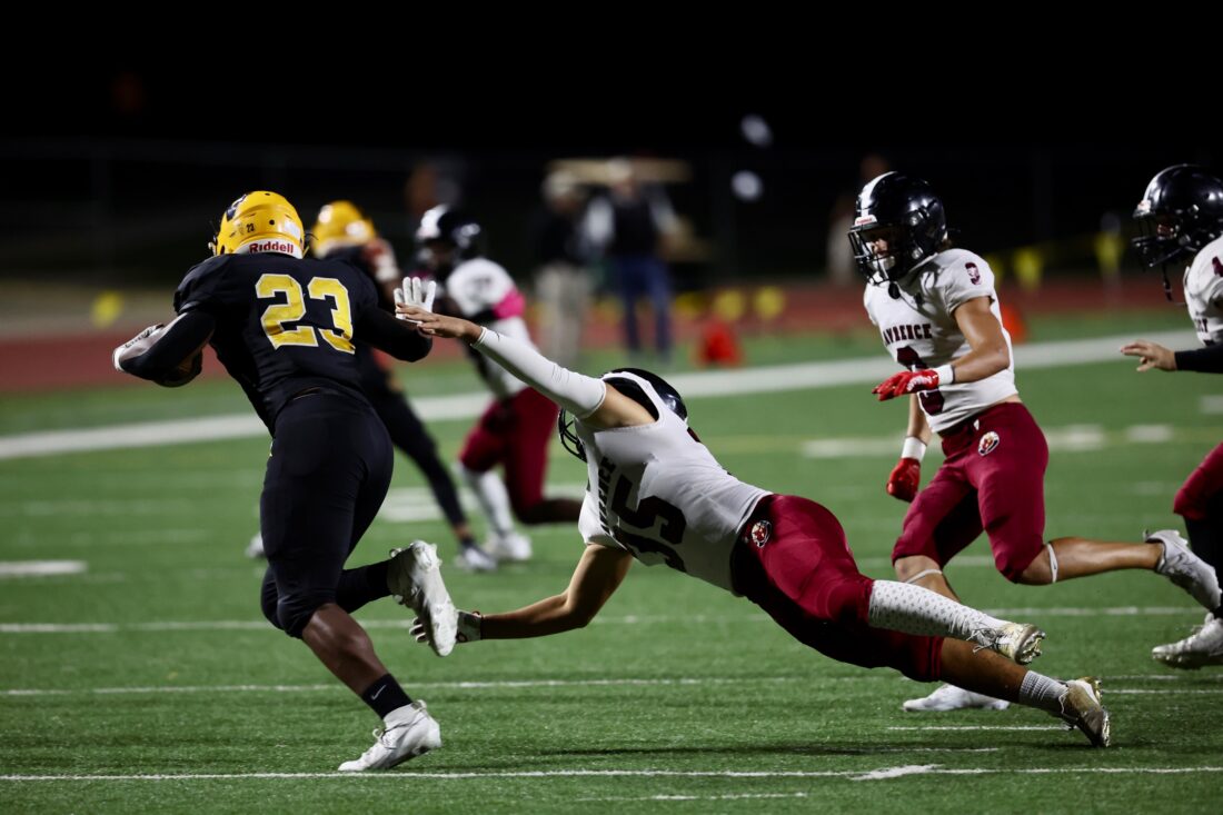 Lawrence High linebacker Jayden Harrell dives to make a tackle on Shawnee Mission West’s My’Shon Mitchell during the game in Overland Park on Friday, Oct. 20, 2023.