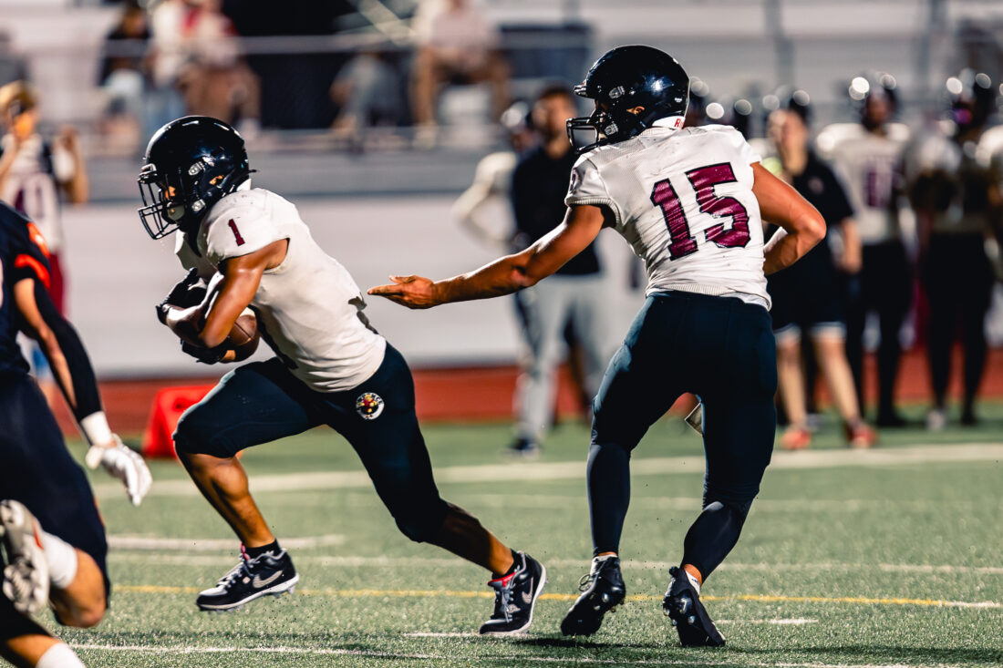 Lawrence High sophomore quarterback Joey Dooley hands the ball to senior running back Tahj Edwards against Shawnee Mission Northwest at Shawnee Mission District Stadium, North Location, on Friday, Oct. 10, 2025 in Overland Park.