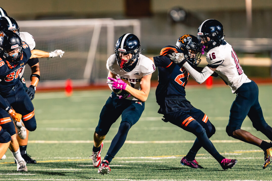 Lawrence High senior wide receiver Jaxon Becker carries the ball down the field against Shawnee Mission Northwest at Shawnee Mission District Stadium, North Location, on Friday, Oct. 10, 2025 in Overland Park.