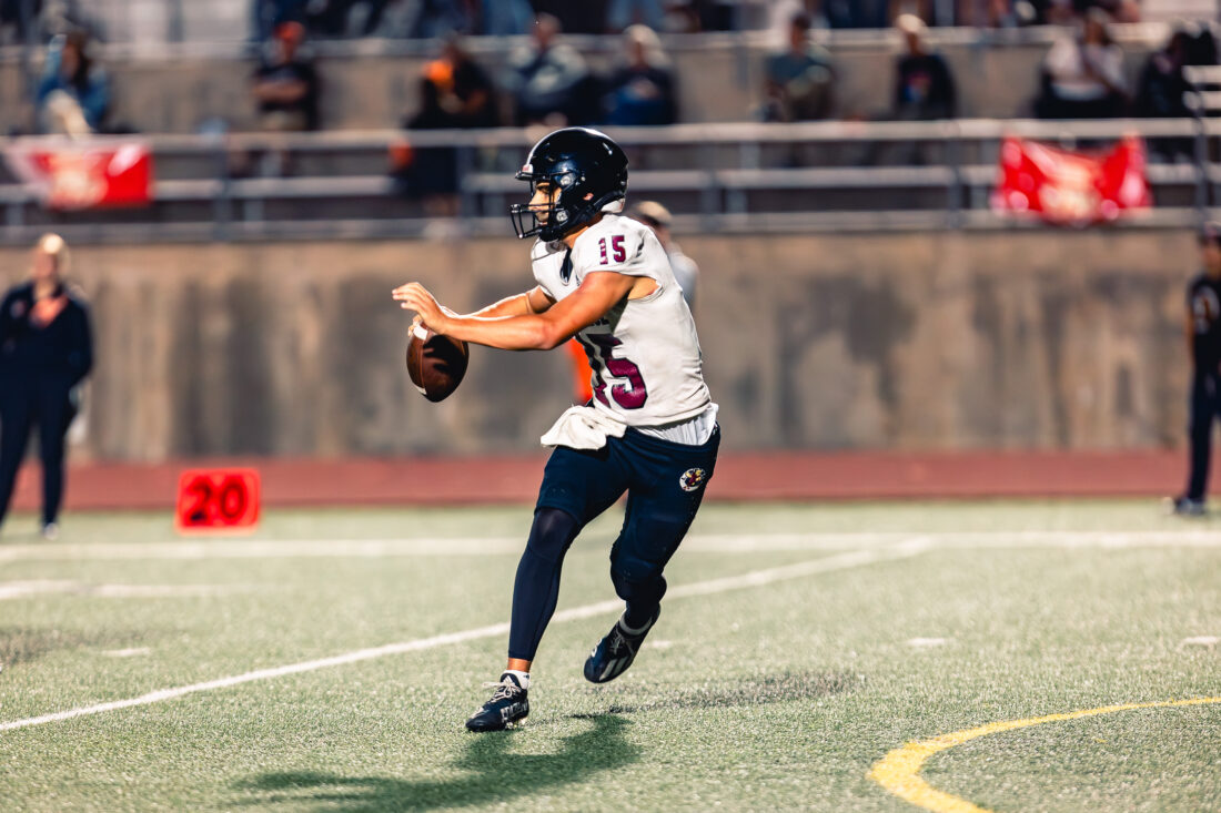 Lawrence High sophomore quarterback Joey Dooley holds out his arm while carrying the ball against Shawnee Mission Northwest at Shawnee Mission District Stadium, North Location, on Friday, Oct. 10, 2025, in Overland Park.