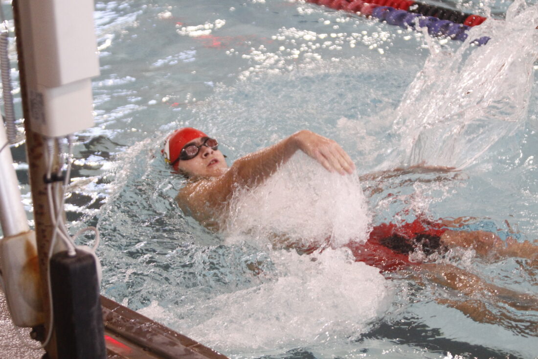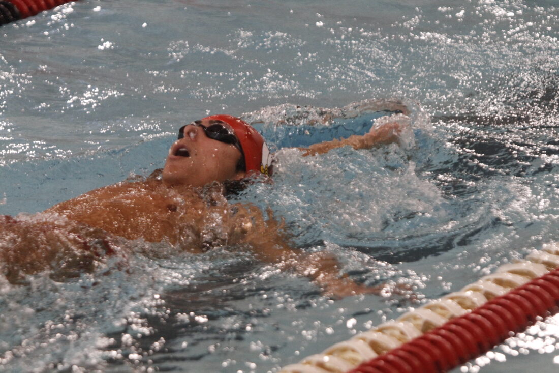 Lawrence swimmer Torin Yung swims the 100-yard backstroke in a home meet on Thursday, Jan. 22, 2026, in Lawrence.