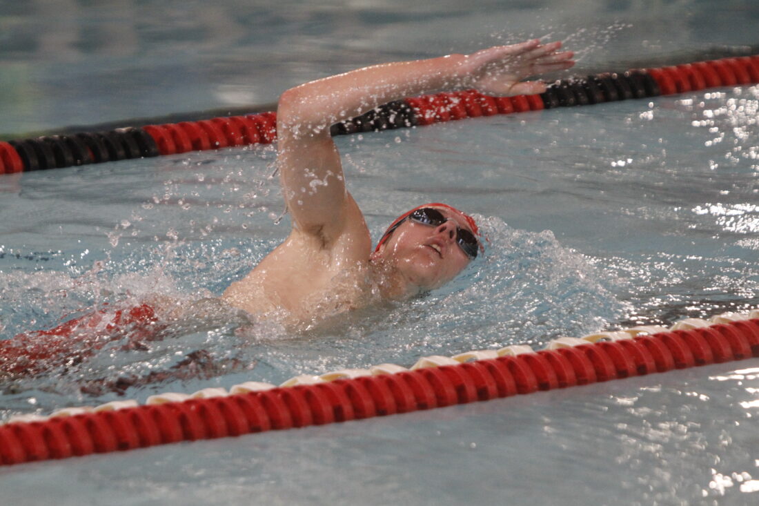 Lawrence swimmer Isaac Reed swims the first leg of the 200-yard medley relay in a home meet on Thursday, Jan. 22, 2026, in Lawrence.