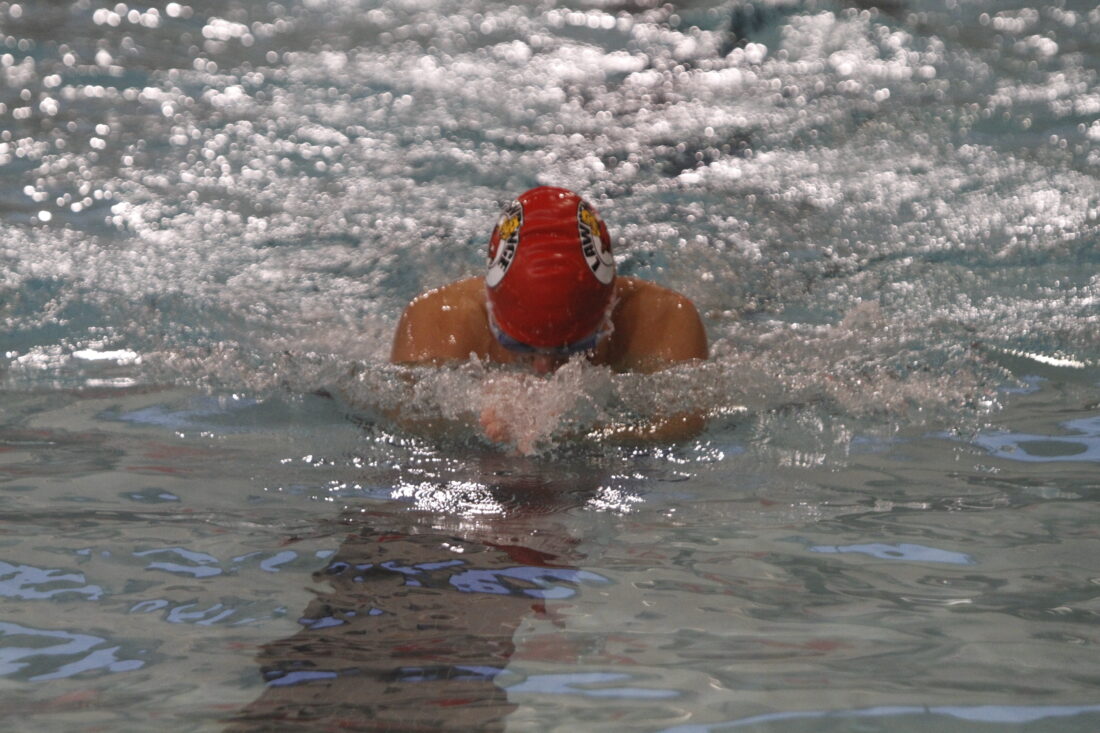 Lawrence swimmer Mateo Klish swims the 100-yard breaststroke in a home meet on Thursday, Jan. 22, 2026, in Lawrence.