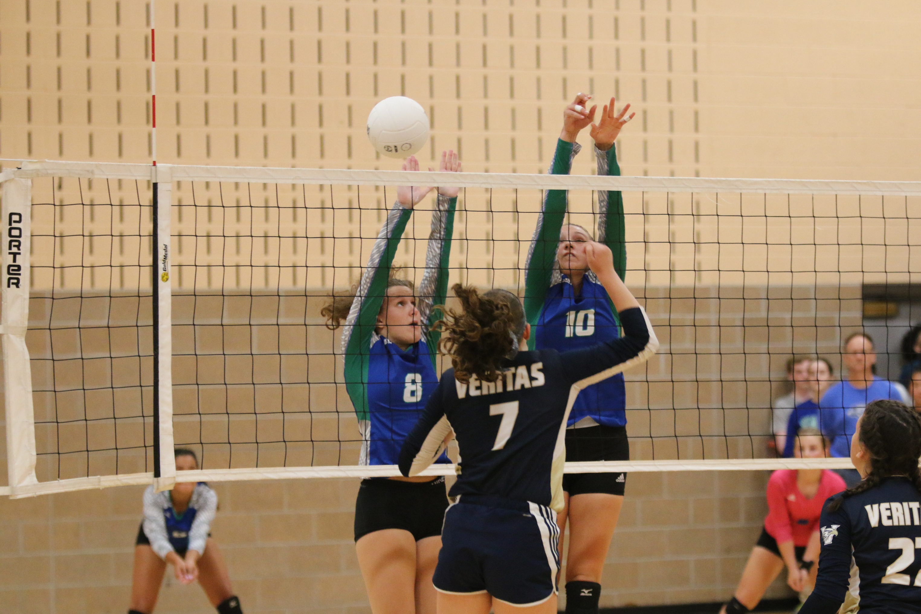 A pair of Bishop Seabury middle blockers try to block the ball in a match against Veritas on Sept. 11, 2018 at the East Lawrence Recreation Center.