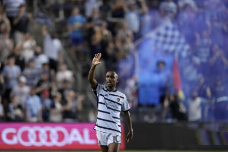 FILE - Sporting Kansas City midfielder Gadi Kinda waves to fans after scoring a goal during the first half of an MLS soccer match against FC Dallas Wednesday, May 31, 2023, in Kansas City, Kan. (AP Photo/Charlie Riedel, File)