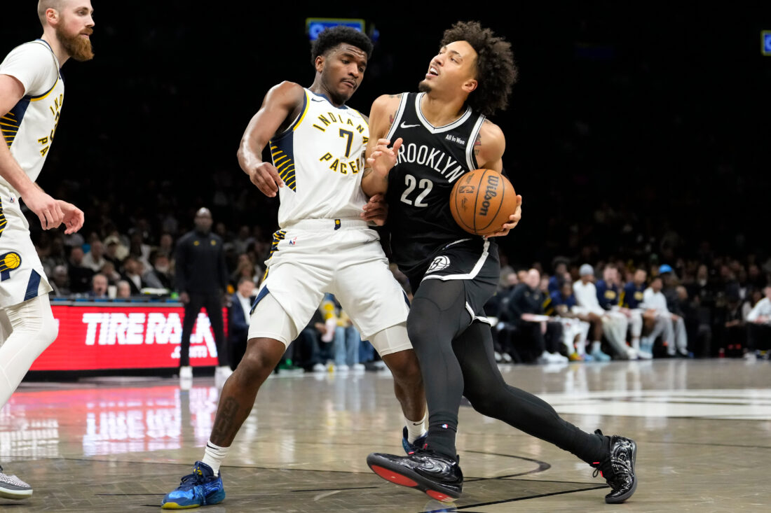 Brooklyn Nets forward Jalen Wilson (22) drives past Indiana Pacers guard Kam Jones (7) during the second half of an NBA basketball game, Thursday, April 9, 2026, in New York.