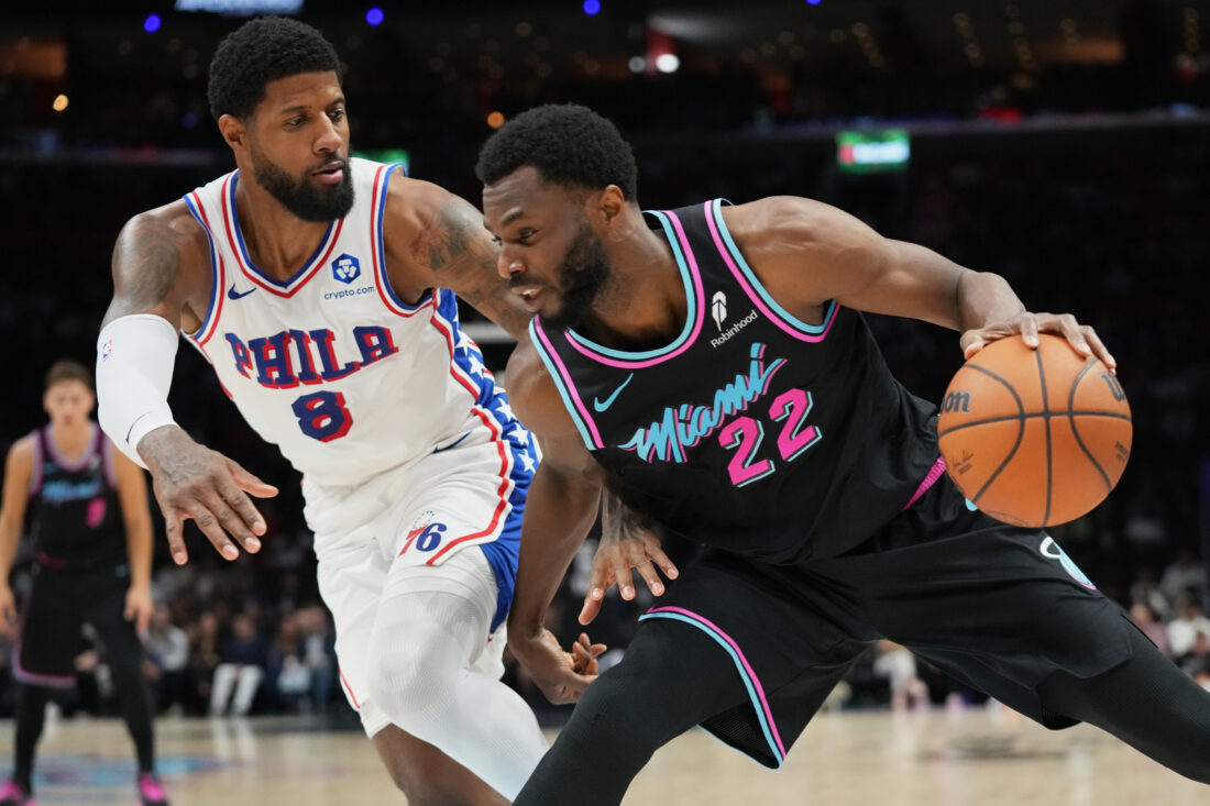 Miami Heat forward Andrew Wiggins (22) drives to the basket as Philadelphia 76ers forward Paul George (8) defends during the second half of an NBA basketball game, Monday, March 30, 2026, in Miami.