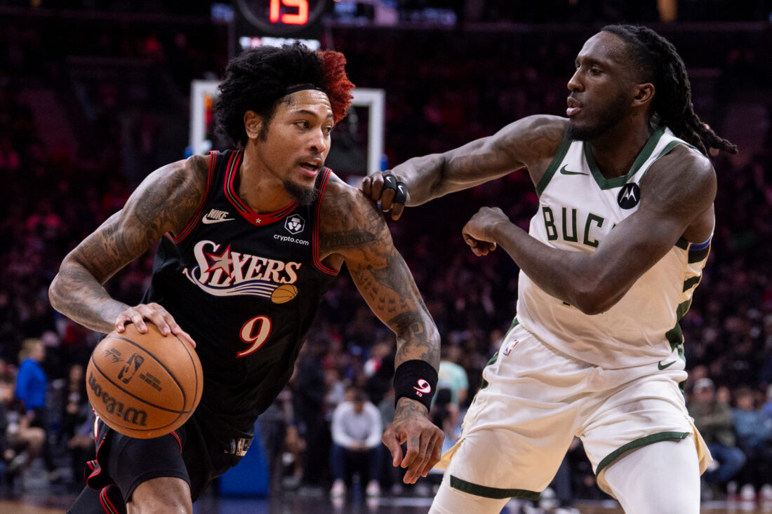 Philadelphia 76ers small forward Kelly Oubre Jr., left, in action against Milwaukee Bucks shooting guard Taurean Prince, right, during the second half of an NBA basketball game, Sunday, April 12, 2026, in Philadelphia. (AP Photo/Chris Szagola)
