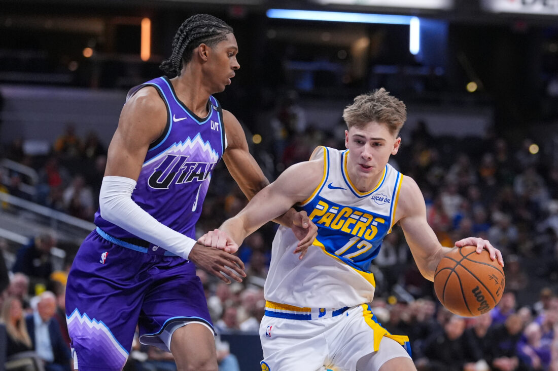 Indiana Pacers guard Johnny Furphy (12) drives on Utah Jazz forward Cody Williams (5) during the second half of an NBA basketball game in Indianapolis, Tuesday, Feb. 3, 2026.