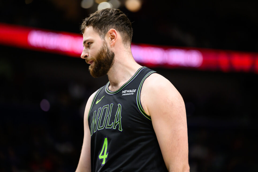 New Orleans Pelicans center Hunter Dickinson (4) stands in the first half against the Orlando Magic in an NBA basketball game in New Orleans, Sunday, April 5, 2026.