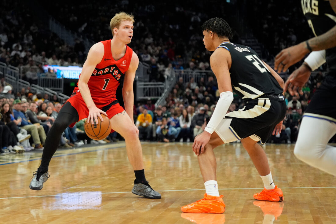 Toronto Raptors’ Gradey Dick dribbles against Milwaukee Bucks’ Ousmane Dieng during an NBA basketball game Sunday, Feb. 22, 2026, in Milwaukee.