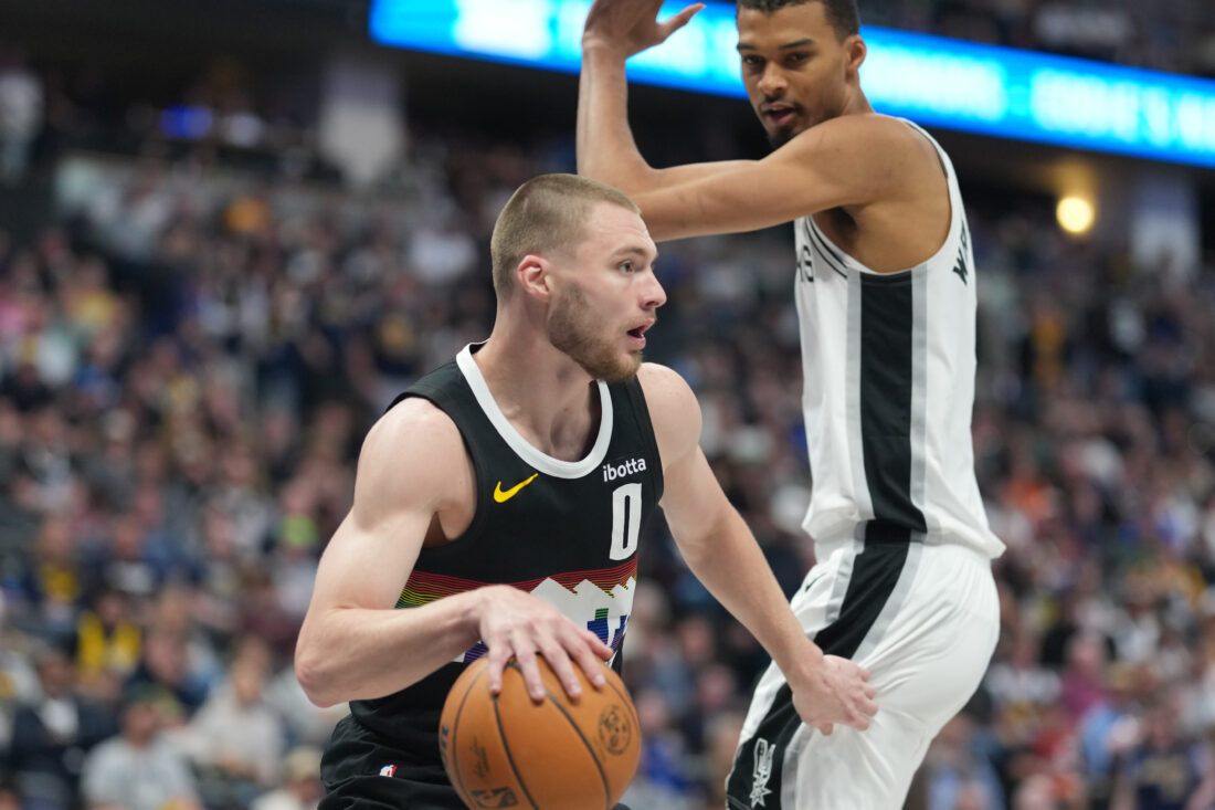Denver Nuggets guard Christian Braun (0) and San Antonio Spurs center Victor Wembanyama (1) in the second half of an NBA basketball game Saturday, April 4, 2026, in Denver.