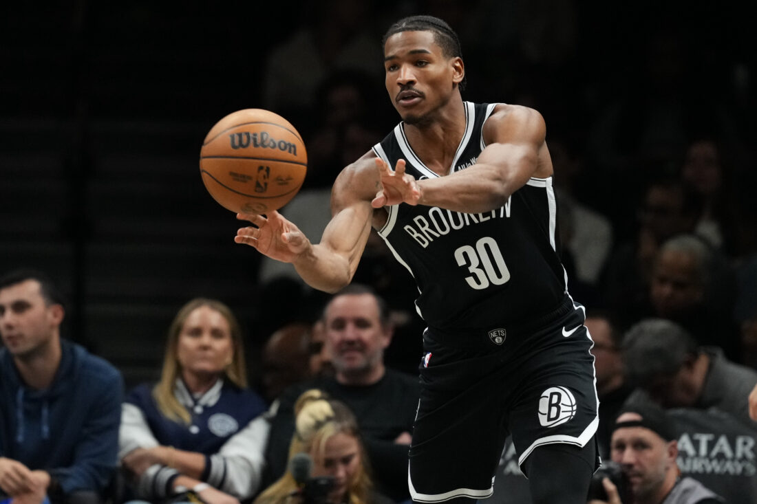 Brooklyn Nets’ Ochai Agbaji (30) during the second half of an NBA basketball game against the Memphis Grizzlies Monday, March 9, 2026, in New York.