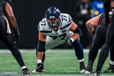 Seattle Seahawks guard Bryce Cabeldue (77) lines up during the second half of an NFL football game against the Atlanta Falcons, Sunday, Dec. 7, 2025, in Atlanta.