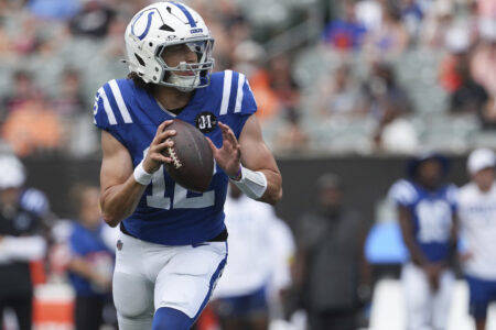 Indianapolis Colts quarterback Jason Bean (12) rolls out out of the pocket looking to pass during the second half of an NFL football game against the Cincinnati Bengals, Saturday, Aug. 23, 2025, in Cincinnati.