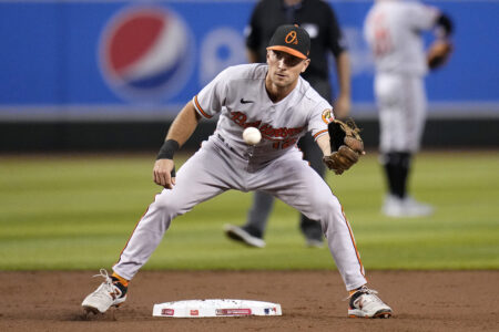 FILE - Baltimore Orioles second baseman Adam Frazier takes a throw down to second base during the first inning of a baseball game against the Arizona Diamondbacks Friday, Sept. 1, 2023, in Phoenix. The Kansas City Royals and Frazier agreed to a $4.5 million, one-year contract to provide the club with a left-handed bat and some versatility in the lineup, a person with knowledge of the deal told The Associated Press on Saturday, Jan. 27, 2024. (AP Photo/Ross D. Franklin, File)