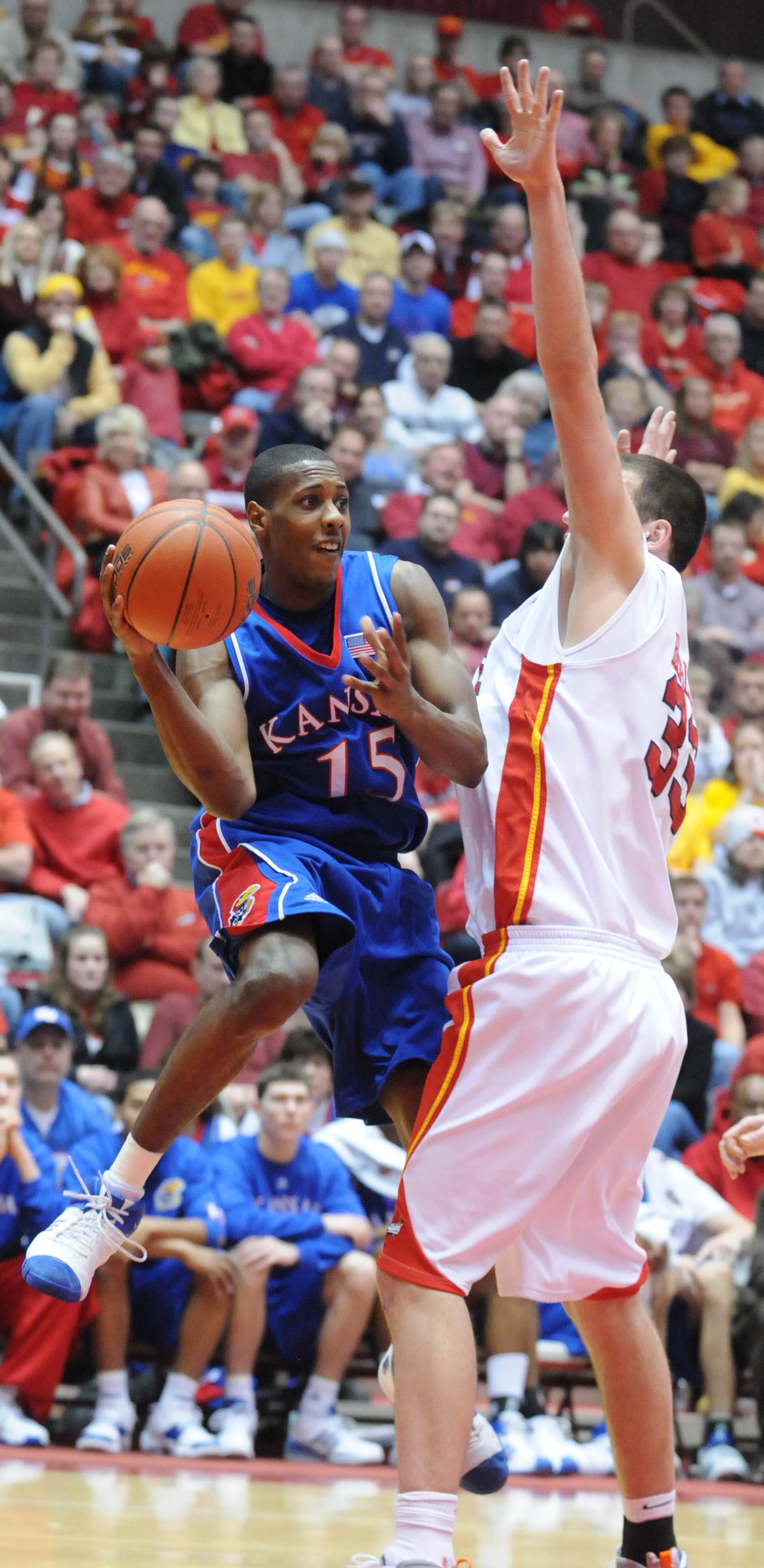 Kansas guard Mario Chalmers, left, edges around Iowa State center Jiri Hubalek for a pass. Chalmers finished with 15 points and two assists.