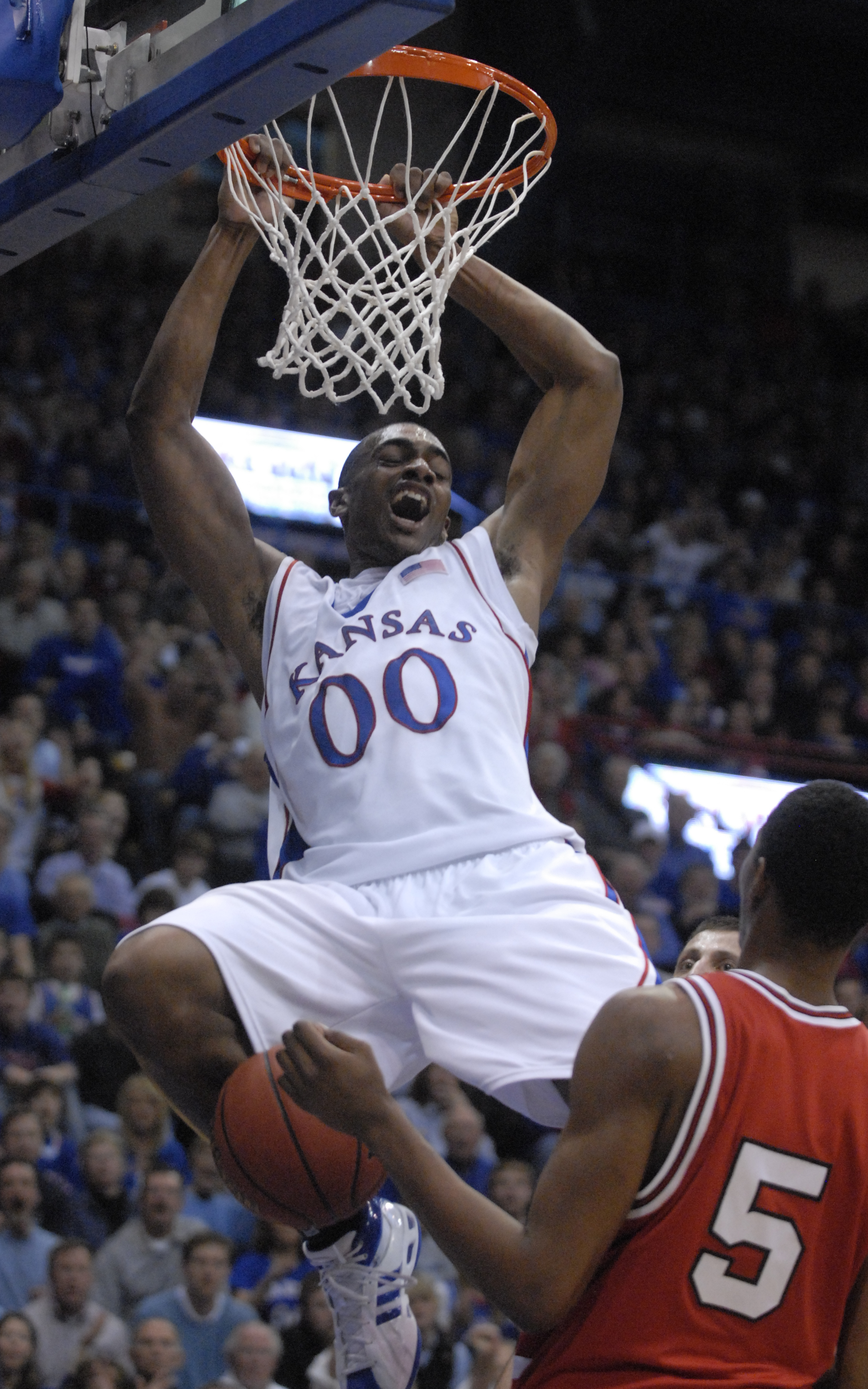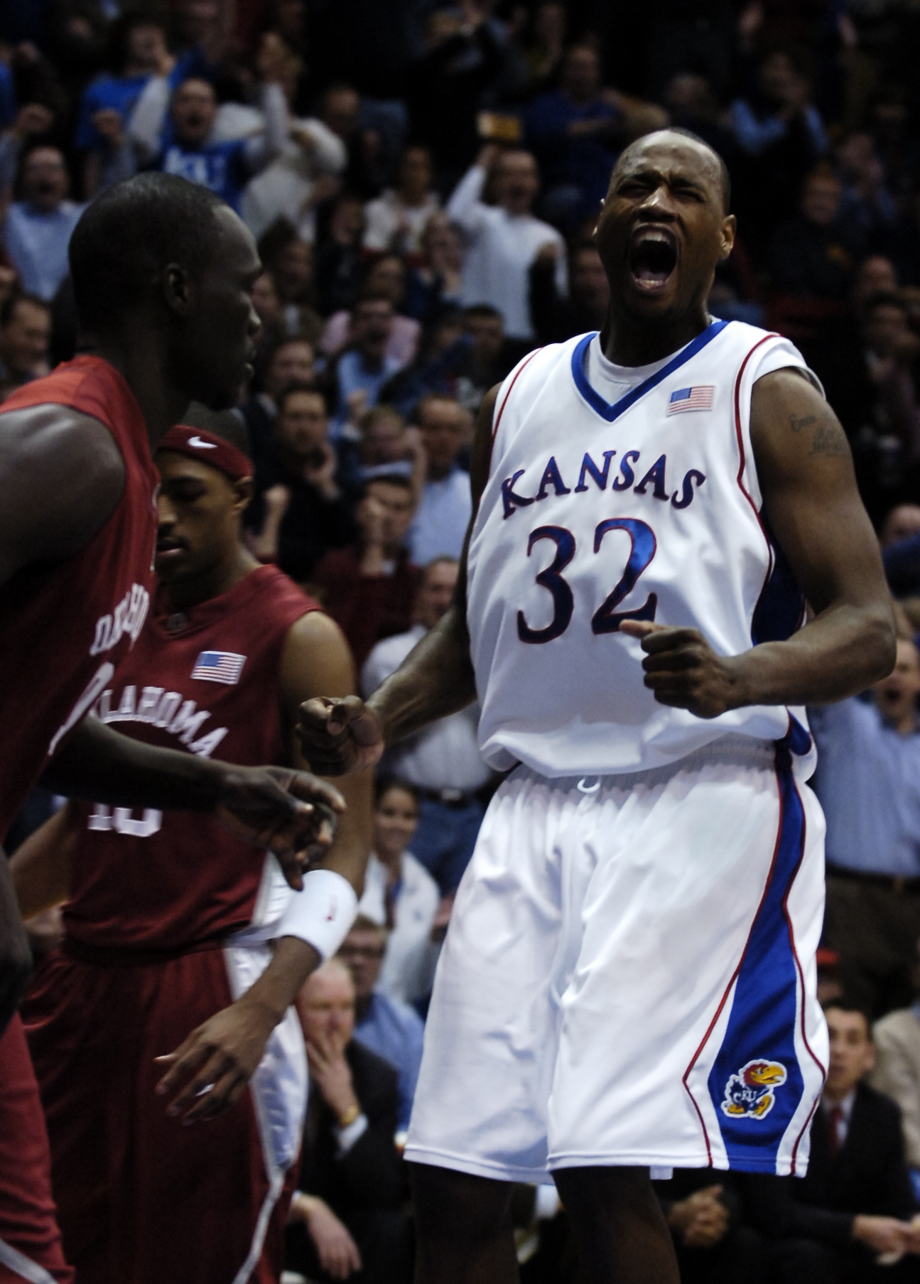 Kansas University forward Darnell Jackson roars after a dunk on the opening drive against Oklahoma. The slam set the tone for Jackson and the Jayhawks; he went on to lead KU with 17 points in an 85-55 blowout of the Sooners on Monday at Allen Fieldhouse. Jackson was officially traded to the Kings Wednesday.